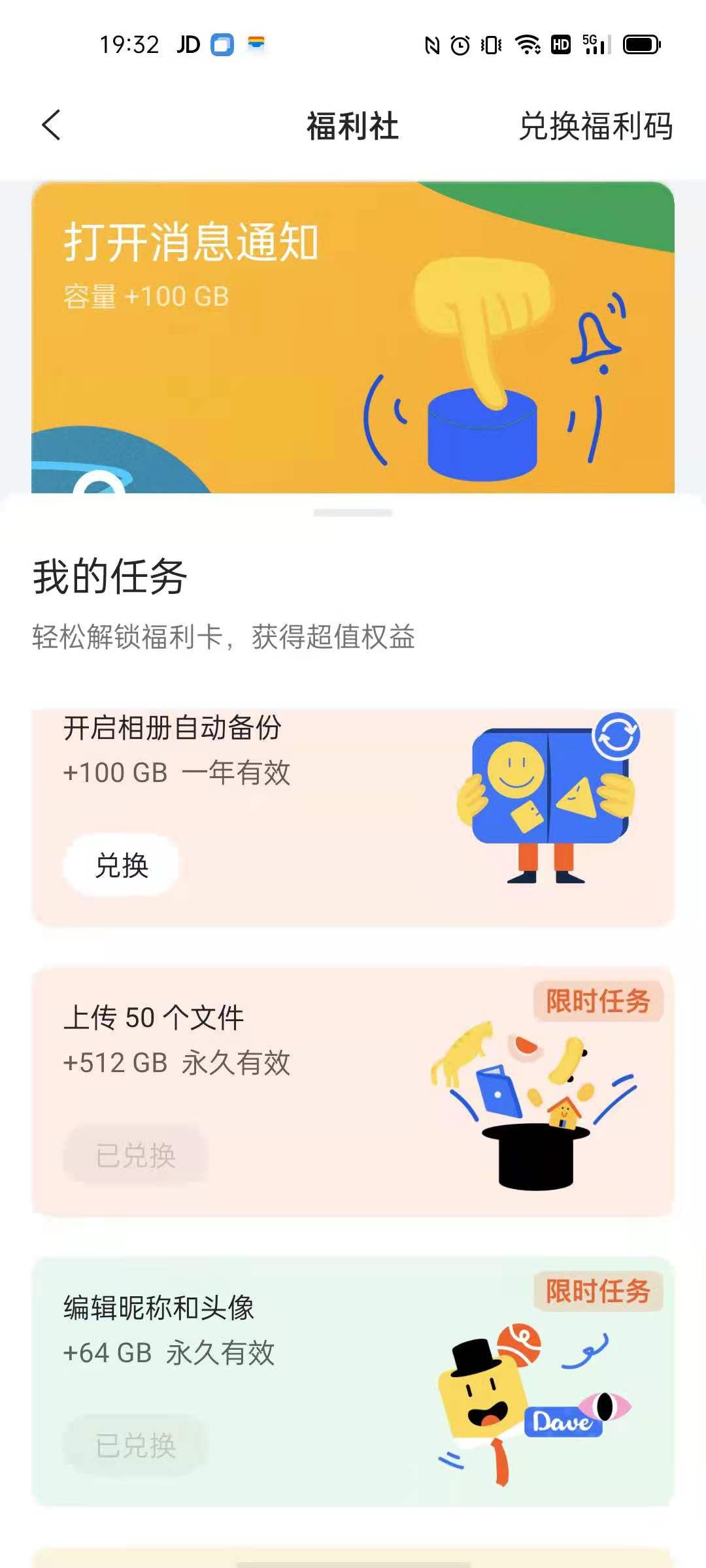 通过上传文件50个和编辑头像,可以获取512GB和64GB永久流量!!
