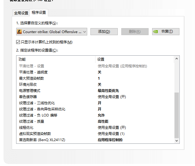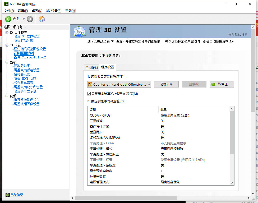 首先我们打开 NVIDIA 控制面板选择管理 3D 设置,然后切换到程序设置,这样是为了只修改 CSGO 的设置而不影响其他程序。