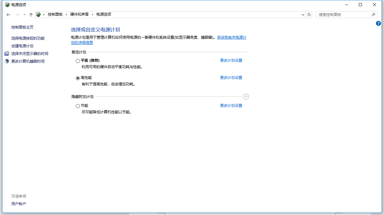 我们直接切换到高性能即可,如果没有发现高性能,通常在下方的隐藏附加计划内。