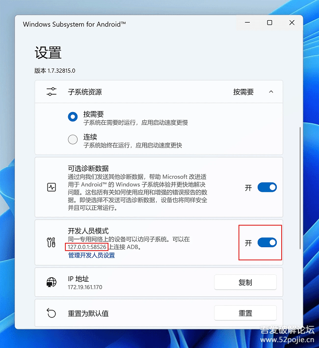 其中 127.0.0.1:58526 是刚才在 WSA 设置项中看到的 IP